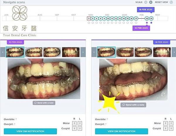 ▲以上圖為例,使用者的牙套並沒有與牙齒緊密貼合,但只要透過Dental Monitoring,無須回診就可即刻給予最佳療程建議